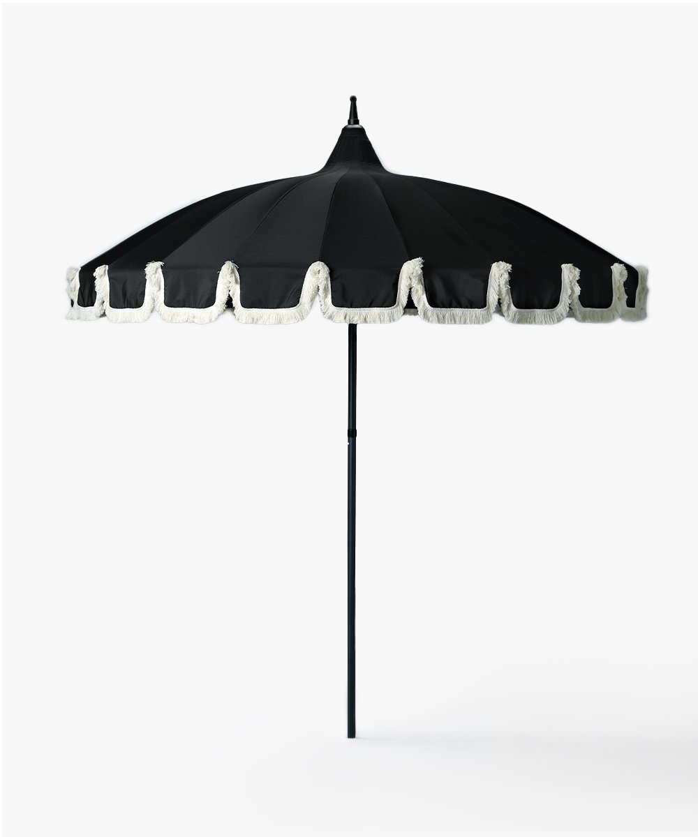 Šis prabangus juodas sodo skėtis su dekoratyviniais kutais – elegantiškas pasirinkimas tiek moderniems, tiek bohemiškiems renginiams.