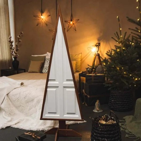 Pastatoma medinė eglutė – originali ir minimalistinė Kalėdų dekoracija, skirta tiems, kurie vertina natūralumą, estetiką ir skandinavišką stilių.